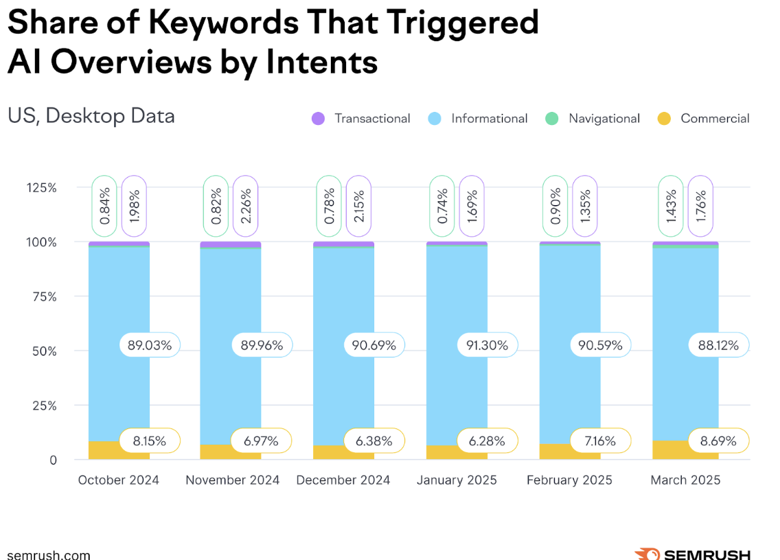 A graph of the monthly share of queries triggering AI Overviews (January → March spike) shows how rapidly AI is being integrated into results. The steep curve is a warning signal that adoption is accelerating faster than most marketers planned for.